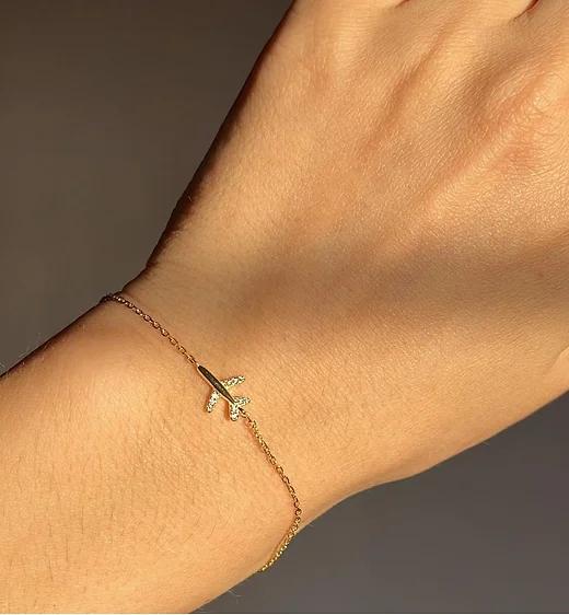 This delicate airplane bracelet is a beautiful and minimalistic accessory for travel lovers. Crafted with a sleek, gold-tone metal, the bracelet features a small, detailed airplane charm that sits Arshi Stylefully on a thin, elegant chain. Lightweight and comfortable, it is perfect for everyday wear, adding a touch of adventure to any outfit. Whether you're an avid traveler or simply dreaming of your next destination, this bracelet makes for a meaningful addition to your jewelry collection.