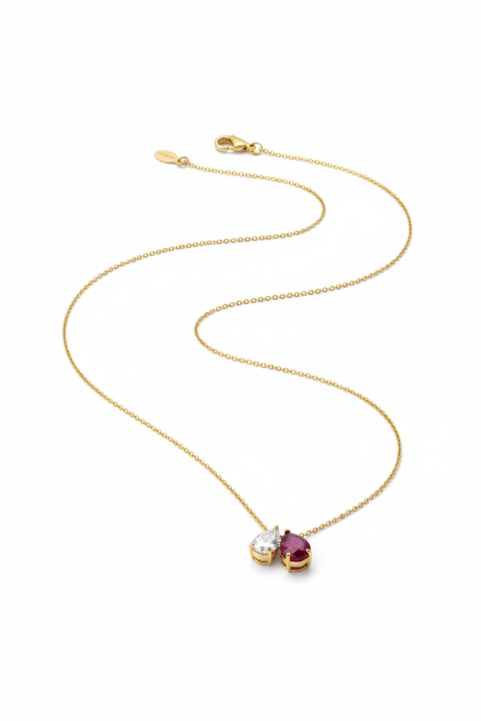 Unveil elegance with our Dual Essence Pendant Necklace, crafted for those who adore versatility and timeless charm. This exquisite design features two teardrop-shaped stones — a radiant clear crystal and a your birthstone Gem — delicately set on a fine 18k gold-plated or silver plated chain.