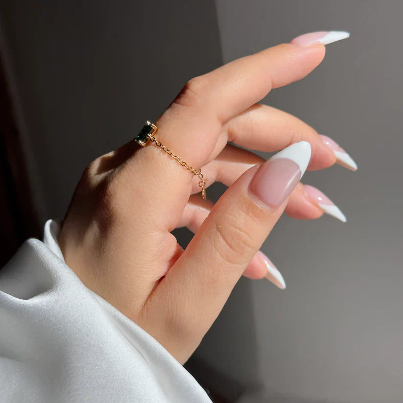 Emerald Prism Ring – A delicate chain ring set with a radiant emerald-cut green stone, reflecting depth, elegance, and timeless charm. A modern statement of Arshi Style with a touch of nature’s brilliance.